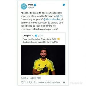 “Alisson, it’s great to see your success! I hope you shine next to Firmino in at Liverpool Football Club. I’m rooting for you! // Alisson Becker, é ótimo ver o seu sucesso! Eu espero que você brilhe ao lado de Firmino no Liverpool. Estou torcendo por você!”