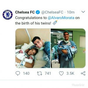 English Premier League side, Chelsea have taken to their social media page to send a congratulatory message to their striker Alvaro Morata on the birth of his twins.