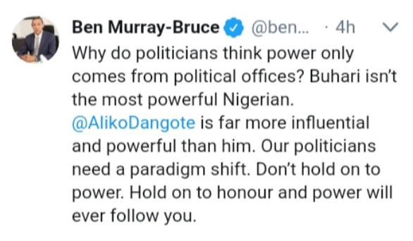 Why do politicians think power only comes from political offices? Buhari isn’t the most powerful Nigerian. @AlikoDangote is far more influential and powerful than him. Our politicians need a paradigm shift. Don’t hold on to power. Hold on to honour and power will ever follow you.