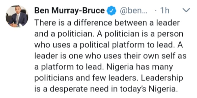 In another tweet, which seems to be a continuation of the first one, he argued that there is a clear difference between Leadership and a politician. He said: