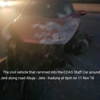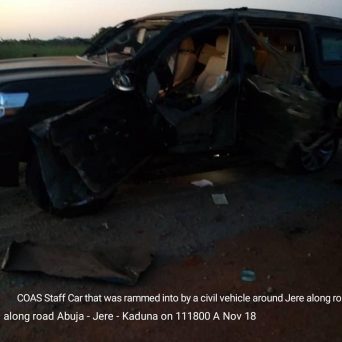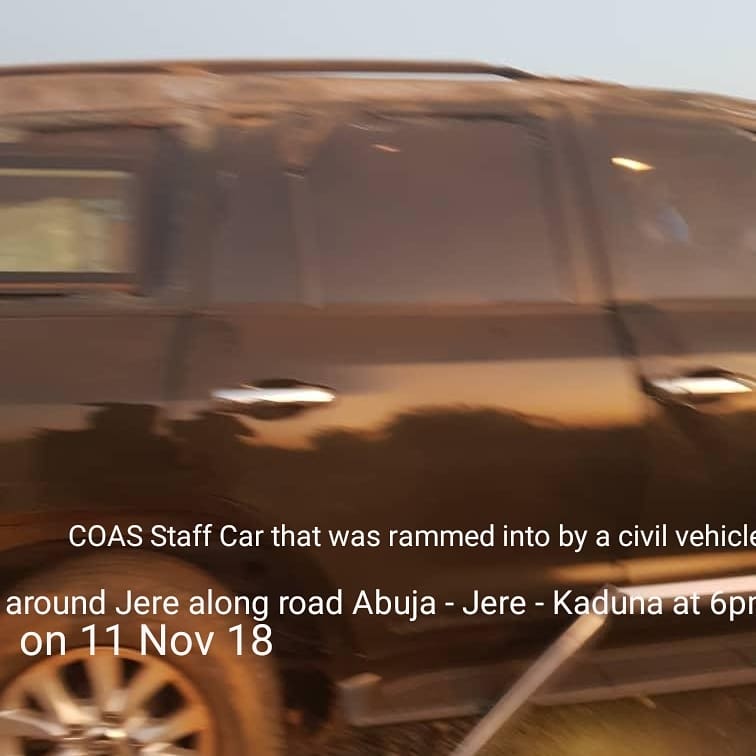 The COAS’ official staff car had an accident at Jere town on the way to Kaduna today 11 November 2018 at about 6.00 p.m. The staff car was in a convoy along with other vehicles when a lone civilian vehicle veered off its lane and rammed into the staff car.