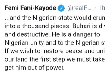 Fani-Kayode in his statement, said, President Buhari is a danger to Nigeria and the Nigerian State. He said for Nigeria to attain peace and Unity, Nigerians must first take back power from the President come 2019.