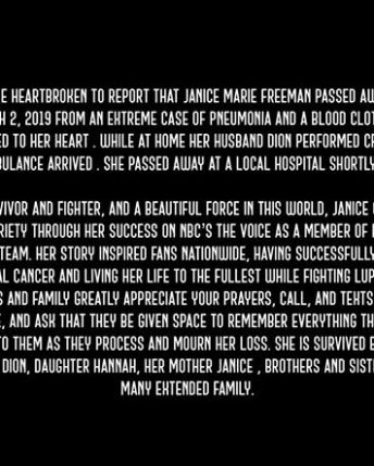Janice Freeman from the popular TV music competition The Voice has been reported to have died by her manager, from a suspected blood clot at age 33.