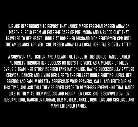 TMZ also reported that Janice’s family tells told reporters she was at home in West Covina with her husband, Dion, when she started complaining she couldn’t breathe. Dion called 911 and had to perform CPR on her until paramedics arrived. She was pronounced dead around 5:30 PM at a hospital,as it appears a blood clot had traveled to her heart.