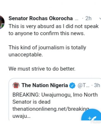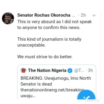 Before the reaction from Senator Rochas Okorocha who is representing Imo West at the green Chamber, the rumour about the death of Senator Benjamin Uwajumogu were reported all over the social media, with Rochas quoted as their source.