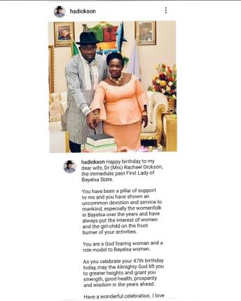 “Happy birthday to my dear wife, Dr (Mrs) Rachael Dickson, the immediate past First Lady of Bayelsa State.