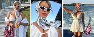 She looked every bit the classic beauty as she sported a white paisley print bandana wrapped around her hair along with matching cat-eye shades.