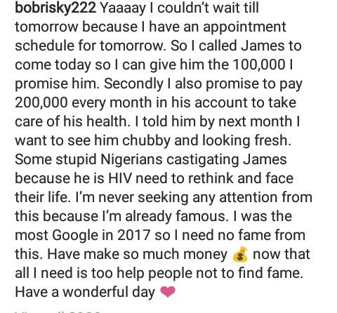 I told him by next month I want to see him chubby and looking fresh. Some stupid Nigerians castigating James because he is HIV need to rethink and face their life. I’m never seeking any attention from this because I’m already famous.