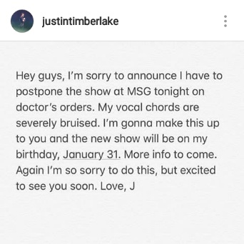 “As a result of bruised vocal chords, the Justin Timberlake Man of The Woods concert tonight is postponed until January 31st. Fans are advised to hold onto their tickets as they will be honoured at the rescheduled event. Justing Timberlake apologizes for the inconvenience to his New York fans but looks forward to celebrating his birthday at the rescheduled event”.