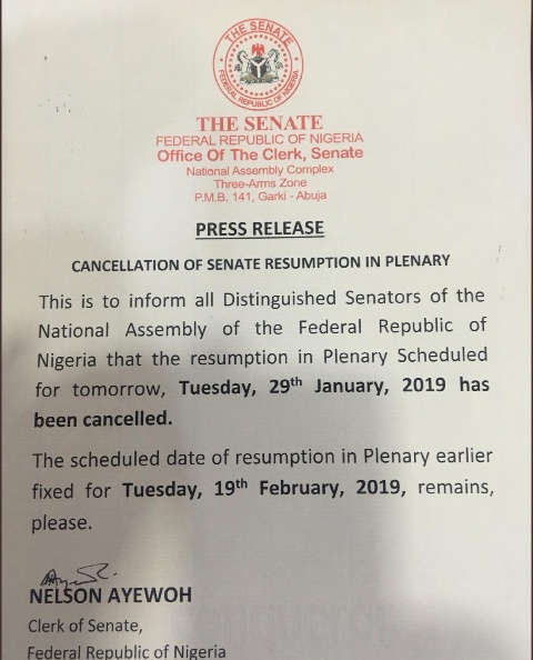 The Nigerian Senate has called off Tuesday 29th January 2019 date for the resumption of plenary, this is to enable it seek Court’s clarification on the issue of the suspended CJN Walter Onnoghen by President Muhammadu Buhari.