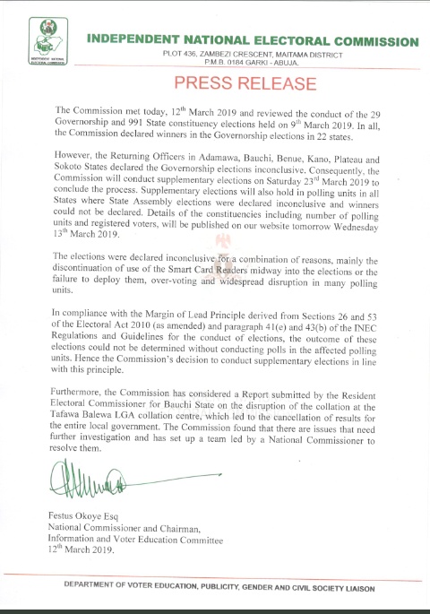 The Independent National Electoral Commission INEC has released a statement on the suspended electoral process in some States, saying there will be a supplementary elections in such affected States.