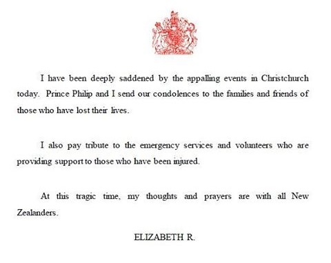 At this tragic time, my thoughts and prayers are with all New Zealanders. – Elizabeth R”