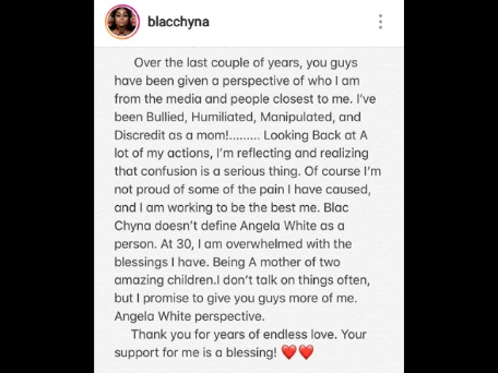She continued, “I’m not proud of some of the pain I have caused and I’m working to be the best me. Blac Chyna doesn’t define Angela White as a person.”