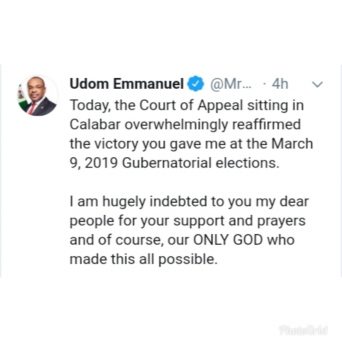 “Today, the Court of Appeal sitting in Calabar overwhelmingly reaffirmed the victory you gave me at the March 9, 2019 Gubernatorial elections. I am hugely indebted to you my dear people for your support and prayers and of course, our ONLY GOD who made this all possible.