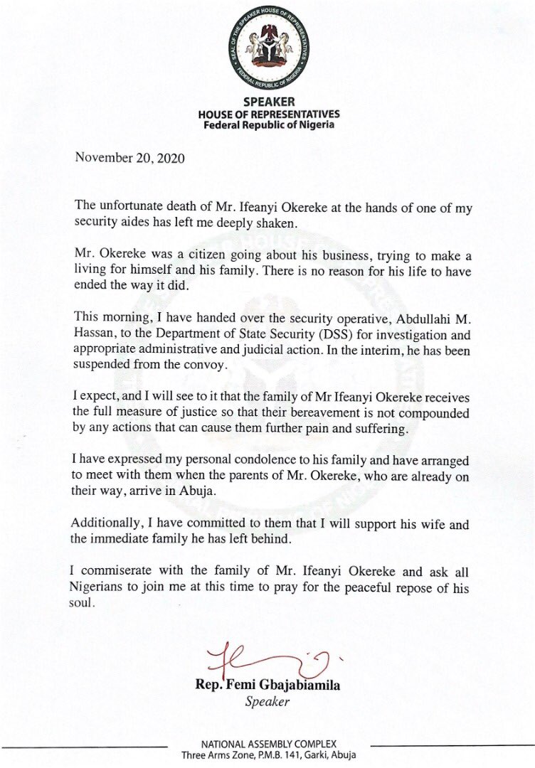 The speaker confirmed this, when he released a new statement on his official Twitter handle, on Friday 20th November 2020. The new statement was an update to the sad incident on Thursday, where he reported that one of the security operatives attached to his convoy shot in the air to disperse some crowd, but unfortunately, one person was hit and killed from the shot fired by the said security aide. The victim was later identified as one Ifeanyi Okereke who was a newspaper vendor in Abuja.